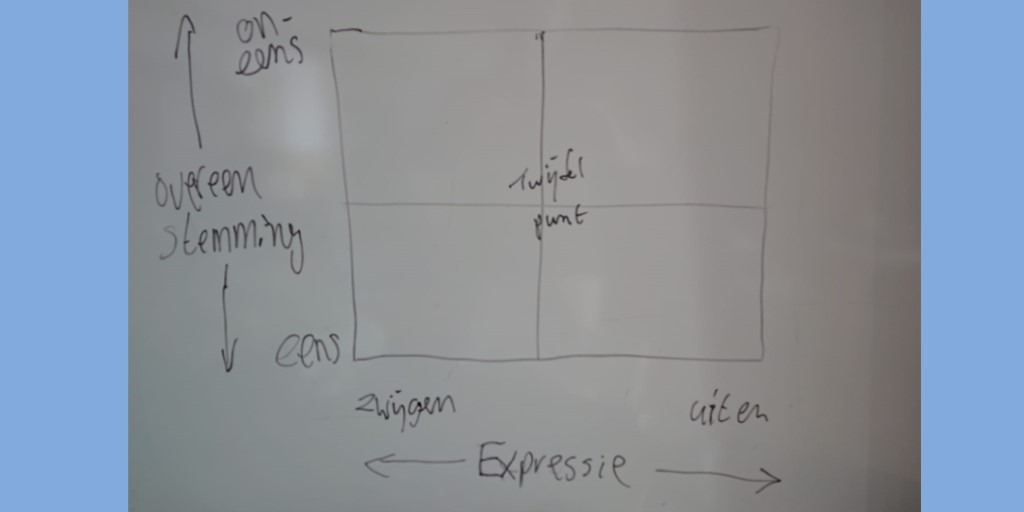 Dat puzzelen is niet bedoeld om een vraagstuk op te lossen, maar om je al puzzelend bewust te worden van wat er zich in je publiek afspeelt. Op de X-as wordt de mate van expressie (van zwijgen naar spreken) en op de Y-as de mate van overeenstemming (van eens naar oneens) afgezet. Zo ontstaan vier velden waarin je je observaties als spreker kunt plaatsen.