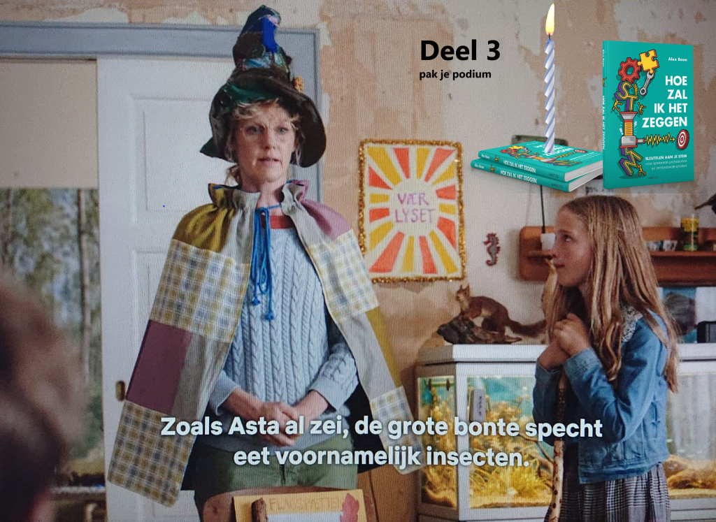 Spreek over iets waar je in thuis bent. Dat klinkt als een open deur, maar ‘je thuis voelen’ op een podium lukt je makkelijker wanneer je bent voorbereid. Je hebt zin om te vertellen, en het is ook leuk om uit te vinden hoe je toehoorders (je huisgenoten) er over denken. Hoe scherper je beeld bij je onderwerp is, hoe beter je dat beeld over kunt brengen. En opnieuw: beelden helpen je om te bewegen. Denk maar aan: uitbeelden, een beeld schetsen, verbeelden, een beeld krijgen, in beeld brengen. Zodra je dat doet, beweeg je op een natuurlijke manier.