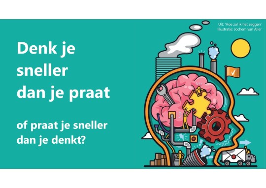 Van snelle sprekers krijg ik vaak te horen dat ze snel spreken omdat ze zo snel denken. Mijn reactie daarop is steevast dat iedereen ‘sneller’ denkt dan spreekt. Het zou toch wat zijn als iemand alle gedachten van het moment direct zou kunnen uiten in spraak. Voordat je over je spreektempo nadenkt, zou je je af kunnen vragen: wat en hoe denk je eigenlijk vóórdat je spreekt?