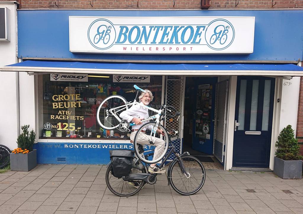 Mijn zus ‘betrapte’ me op een zachte band toen ze bovenstaande foto bekeek; niet de keurig herstelde fiets op mijn schouder maar mijn eigen ros was wat door de achterhand gezakt. Doordat ik wat zwaarder belast was merkte ik dat pas op de terugweg. Nadat ik thuis de banden had opgepompt voelde ik direct het verschil: mijn volgende rit naar Scheveningen verliep uiterst gezwind!