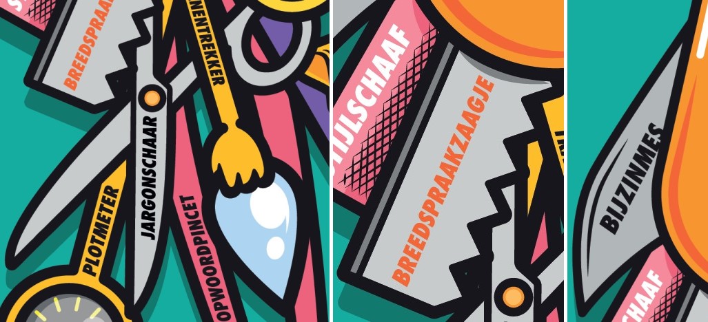 *Het multifunctionele zakmes op de boekenlegger van mijn boek bevat onder meer een handig jargonschaartje, een breedspraakzaagje en een bijzinmes. Die gereedschapjes bestonden tot 2023 alleen in mijn hoofd, maar sinds mijn boek verscheen bestaan ze ook echt: dankzij illustrator en streetartist Jochem van Aller! Zie: www.hoezalikhetzeggen.nl